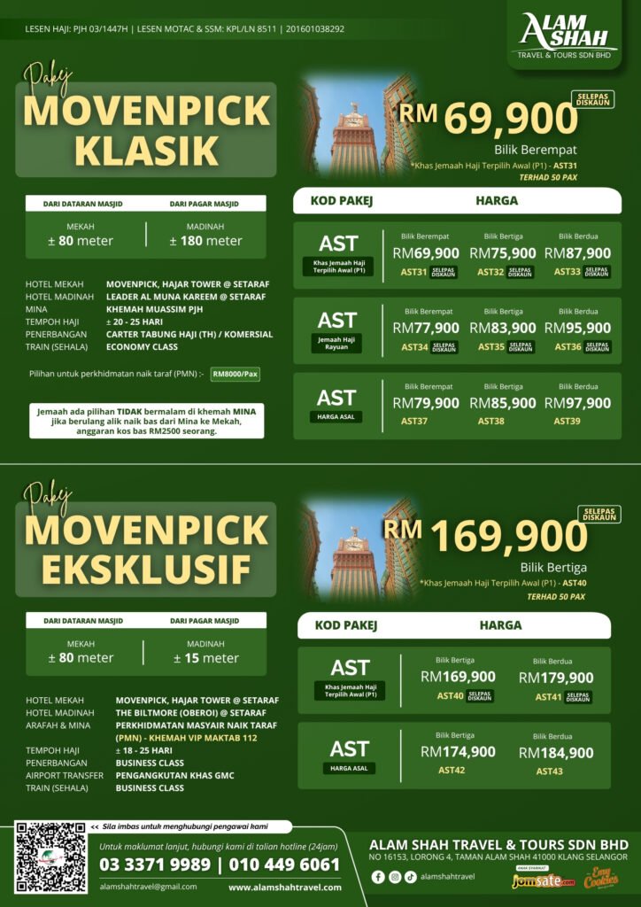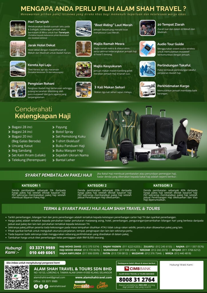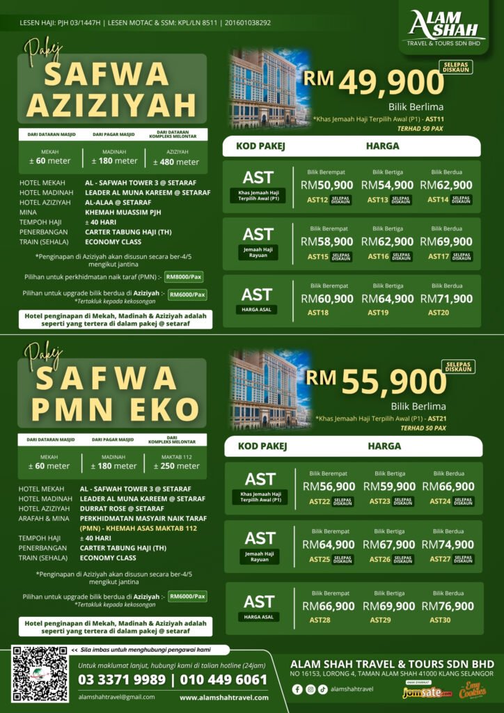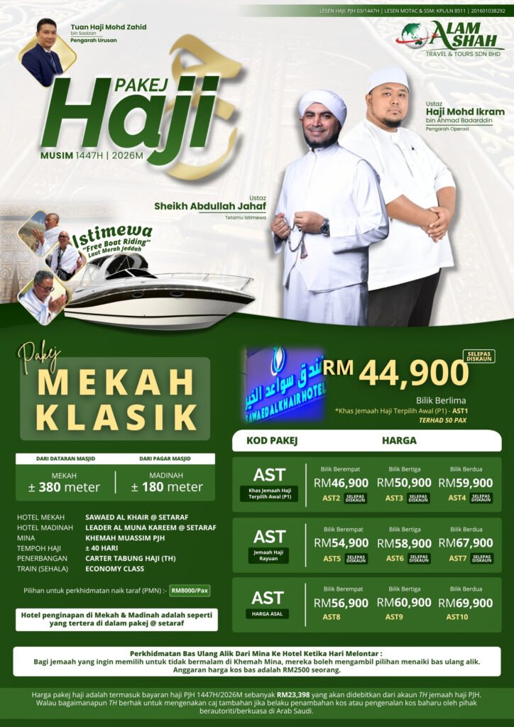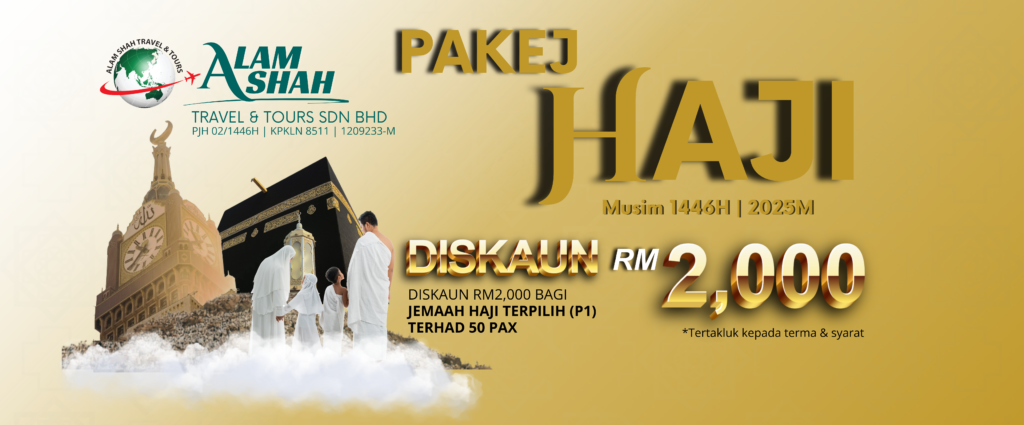 Alam Shah Travel menawarkan pakej Haji yang dirancang dengan teliti untuk memastikan pengalaman ibadah Haji anda berjalan dengan lancar, selesa, dan tertib. Kami menyediakan bimbingan lengkap daripada persiapan sebelum berangkat, semasa di Tanah Suci, sehingga kembali ke tanah air.
